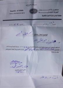 أنت مكلف بالحضور أمامي بديوان محكمة الدامر دائرة الأحوال الشخصية في يوم ٣٠/ ٣/ ٢٠٢٦م الساعة الثامنة صباحا لأخذ أقوالك في دعوى طلاق للضرر ضدك من قبل / حنان آدم شمو، فإن لم تحضر في هذا الميعاد الدعوى فصل الطلب في غيابك.