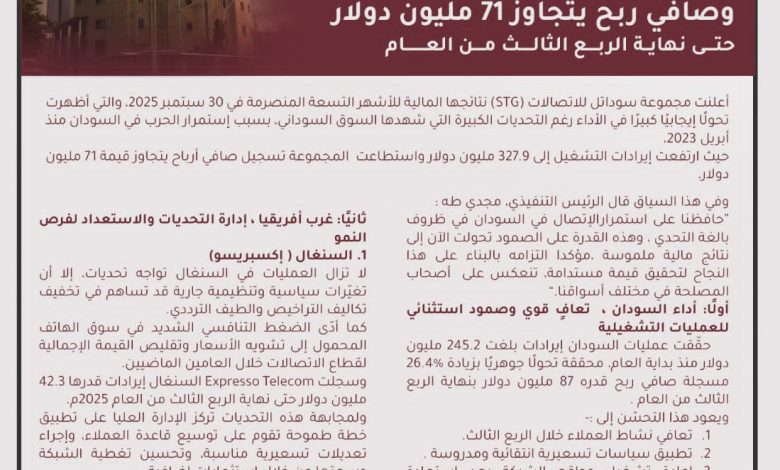 أعلنت مجموعة سوداتل للاتصالات (STG) نتائجها المالية للأشهر التسعة المنصرمة في 30 سبتمبر 2025، والتي أظهرت تحولًا إيجابيًا كبيرًا في الأداء رغم التحديات الكبيرة التي شهدها السوق السوداني، بسبب استمرار الحرب في السودان منذ أبريل 2023،