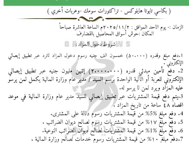 2. دفع تأمين مبدئي قدره (۲.۰۰۰.۰۰۰) إثنين مليون جنيه عبر تطبيق إيصالي الإلكتروني للعربة أو الآلية الواحدة برسم السيد / مدير عام وزارة المالية يكمل لمن يرسو عليه المزاد ويرد لمن لا يرسو له.
