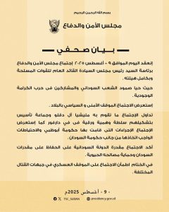 انعقد اليوم الموافق 9 – أغسطس 2025 اجتماع مجلس الأمن والدفاع برئاسة السيد *رئيس مجلس السيادة القائد العام للقوات المسلحة* وبكامل هيئته.