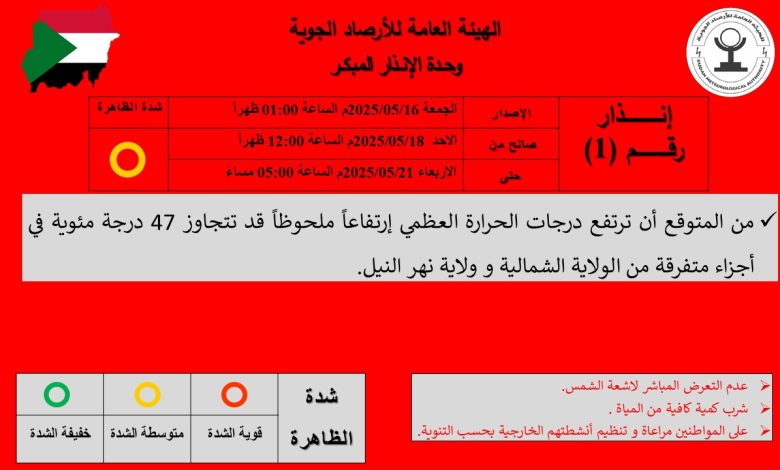 إرتفاع ملحوظ في درجات الحرارة العظمي قد تتجاوز 47 درجة مئوية في أجزاء متفرقة من الولاية الشمالية و ولاية نهر النيل