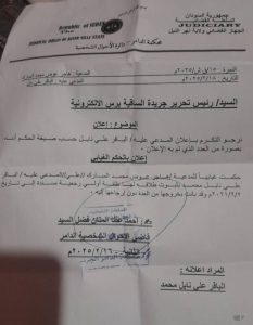 نرجو التكرم بإعلان المدعى عليه/ الباقر علي نايل، حسب صيغة الحكم أدناه ومدنا بصورة من العدد الذي تم به الإعلان.