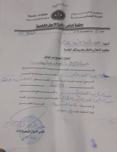 تقدم إلينا المدعو/ عبدالرحيم أحمد بشير بطلب يريد فيه تصحيح اسمه حيث أنه قد ورد خطأ بسجل الساقية رقم ٢٩ العكد الدامر ، باسم/ عبدالرحيم أحمد بشير، والصحيح هو عبدالرحيم أحمد بشير عثمان، عليه كل من يدعي حقه في هذه الساقية عليه الحضور لهذه المحكمة لجلسة ٢٩/ ٥ / ٢٠٢٥م .