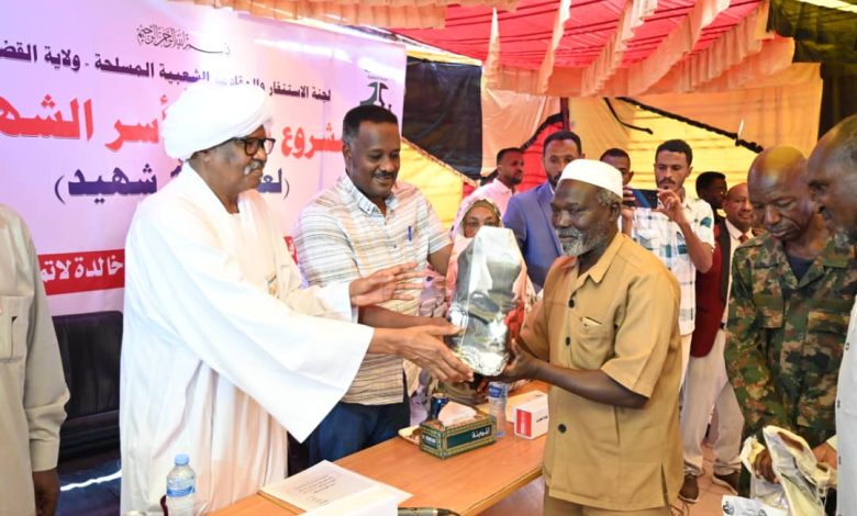 و دعا خلال تدشينه اليوم مشروع أضحية أسر الشهداء لعدد ( ١٥٢ ) أسرة الذى نفذته لجنة الإستنفار و المقاومة الشعبية المسلحة بالقضارف و مشروع فرحة العيد الذى نظمته لجنة المرأة بالمقاومة لأسر الشهداء و إستراحات الجرحى بحضور عدد من المسؤولين دعا المقاومة الشعبية لإعداد و تجهيز ملفات متكاملة للشهداء والمقاتلين والمتدربين من المستنفرين حفظا للحقوق ووعد بتقديم المزيد من الدعومات لأسر الشهداء في المجالات كافة.