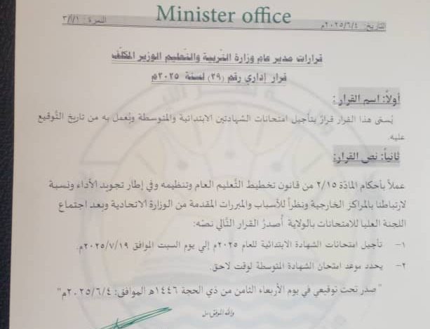 أصدر الأستاذ أحمد حامد أحمد يس، المدير العام لوزارة التّربية والتّعليم بولاية نهر النّيل، الوزير المُكَلّف،ووفقاً لمخرجات اجتماع اللّجنة العليا للامتحانات بالولاية. القرار الإداري بالرّقم(٢٩) لسنة٢٠٢٥م، الذي قضى بتأجيل امتحانات الشّهادة الابتدائيّة للعام(٢٠٢٥م) إلى يوم السّبت الموافق للتّاسع عشر من يوليو المقبل.
