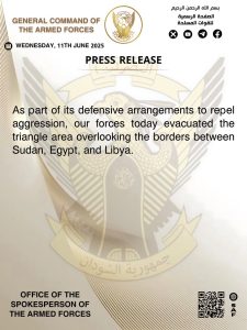 As part of its defensive arrangements to repel aggression, our forces today evacuated the triangle area overlooking the borders between Sudan, Egypt, and Libya.