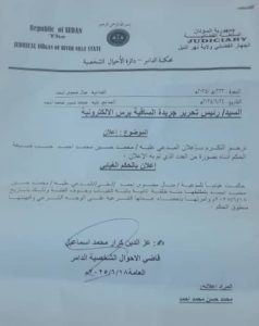 نرجو التكرم بإعلان المدعى عليه / محمد حسين محمد أحمد، ومدنا بصورة من العدد الذي تم به الإعلان .