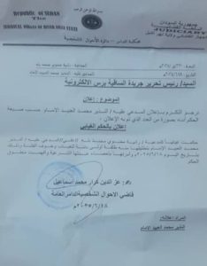 نرجو التكرم بإعلان المدعى عليه / النذير محمد العبيد الإمام، ومدنا بصورة من العدد الذي تم به الإعلان .