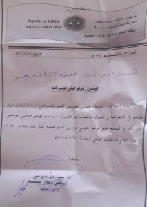 تقدم إلينا المدعو/ توتو جيلي موسى كنو بطلب يريد فيه تصحيح اسمه حيث أنه قد ورد خطأ في الحواشة والمنزل بالمكابراب القرية ٤ باسم/ توتو جيلي موسى عبدالله، والصحيح هو توتو جيلي موسى كنو، عليه كل من يدعي حقه في هذه الحواشة عليه الحضور لهذه المحكمة لجلسة ٣٠/ ٧ / ٢٠٢٥م.
