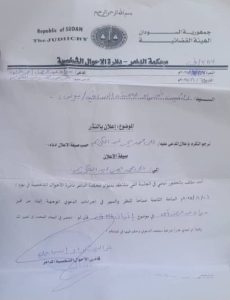 أنت مكلف بالحضور أمامي في الجلسة التي ستنعقد بديوان محكمة الدامر دائرة الأحوال الشخصية في يوم ٢٤/ ٨/ ٢٠٢٥م الساعة الثامنة صباحا للنظر والسير في إجراءات الدعوى الموجهة إليك من قبل/ حياة عبدالرحمن أحمد، في موضوع/ طلاق للغياب فإن لم تحضر في الميعاد المحدد أو تعين لك وكيلا أو تبدئ عذرا شرعيا سمعت الدعوى وحكم فيها في غيابكم.
