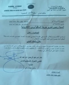 نرجو التكرم بإعلان المدعى عليه / يحيى بخيت أحمد عيسى حسب صيغة الحكم أدناه ومدنا بصورة من العدد الذي تم به الإعلان.