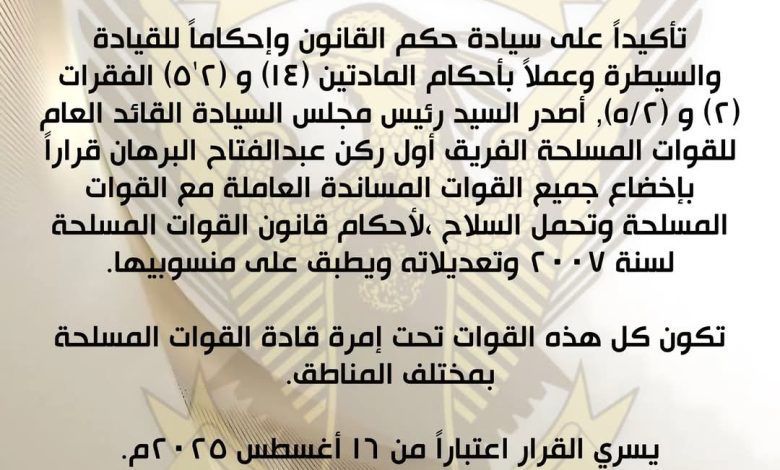 قرار بإخضاع جميع القوات “المساندة” لأحكام القوات المسلحة وتحت إمرة قادة الجيش