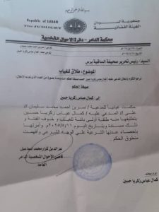 نرجو التكرم بإعلان المدعى عليه كمال عباس زكريا حسين، حسب صيغة الحكم أدناه ومدنا بصورة من العدد الذي تم به الإعلان