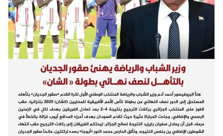 هنأ البروفيسور أحمد آدم وزير الشباب والرياضة المنتخب الوطني الأول لكرة القدم “صقور الجديان” بتأهله المستحق إلى الدور نصف النهائي من بطولة كأس الأمم الأفريقية للمحليين (الشان) 2025 بتنزانيا، عقب الفوز على المنتخب الجزائري بركلات الترجيح بنتيجة 4-2 بعد تعادل الفريقين بهدف لكلٍ في الزمنين الرسمي والإضافي.