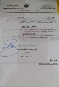 نرجو التكرم بإعلان المدعى عليه/ عبدالعزيز محمد عبدالله أحمد، حسب صيغة الحكم أدناه ومدنا بصورة من العدد الذي تم به الإعلان.