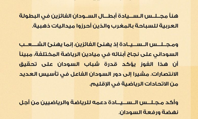 هنأ مجلس السيادة أبطال السودان الفائزين في البطولة العربية للسباحة بالمغرب والذين أحرزوا ميداليات ذهبية.