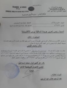 نرجو التكرم بإعلان المدعى عليه / عبدالرحيم هاشم عبدالرحيم حسب صيغة الحكم أدناه ومدنا بصورة من العدد الذي تم به الإعلان.