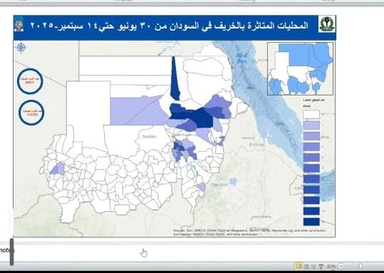 وقالت اللجنة في اجتماعها اليوم الإثنين، ان تراكمي الولايات المتأثرة بالسيول والامطار في الفترة من 30 يونيو وحتى 14 سبتمبر الجاري 11 ولاية هي (الجزيرة، القضارف، الشمالية، النيل الأزرق، كسلا، نهر النيل، وسط دارفور، غرب وشمال كردفان، سنار، والبحر الأحمر)، منها (49) محلية، و(260) منطقة، فيما تضررت (21،811) أسرة، و(113،723) فرداً.