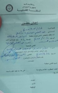 أنت مكلف بالحضور أمامي بديوان هذه محكمة الدامر الجزئية في يوم ٢/ ١٠/ ٢٠٢٥م الساعة ٨:٠٠ صباحا لأخذ أقوالك في دعوى عمر علي محمد //ضد // عبدالمنعم أبوريدة رابح