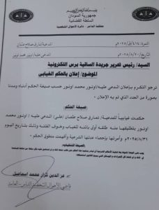 نرجو التكرم بإعلان المدعى عليه/ أونور محمد أونور حسب صيغة الحكم أدناه ومدنا بصورة من العدد الذي تم به الإعلان.
