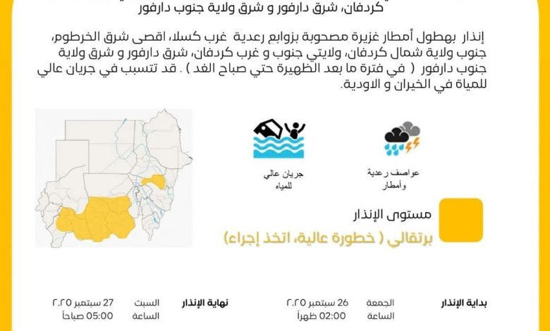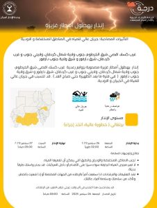 أصدرت الهيئة العامة للأرصاد الجوية اليوم إنذاراً باللون البرتقالي من خطورة عالية، حيث يُتوقع هطول أمطار غزيرة مصحوبة بعواصف رعدية، في كل من غرب كسلا، أقصى شرق الخرطوم، جنوب شمال كردفان، جنوب وغرب كردفان، شرق دارفور، شرق جنوب دارفور.