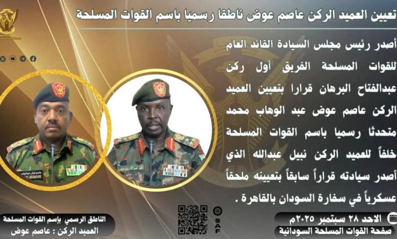 أصدر رئيس مجلس السيادة القائد العام للقوات المسلحة الفريق أول ركن عبدالفتاح البرهان قرارا بتعيين العميد الركن عاصم عوض عبد الوهاب محمد متحدثا رسميا باسم القوات المسلحة خلفاً للعميد الركن نبيل عبدالله الذي أصدر سيادته قراراً سابقاً بتعيينه ملحقاً عسكرياً في سفارة السودان بالقاهرة .