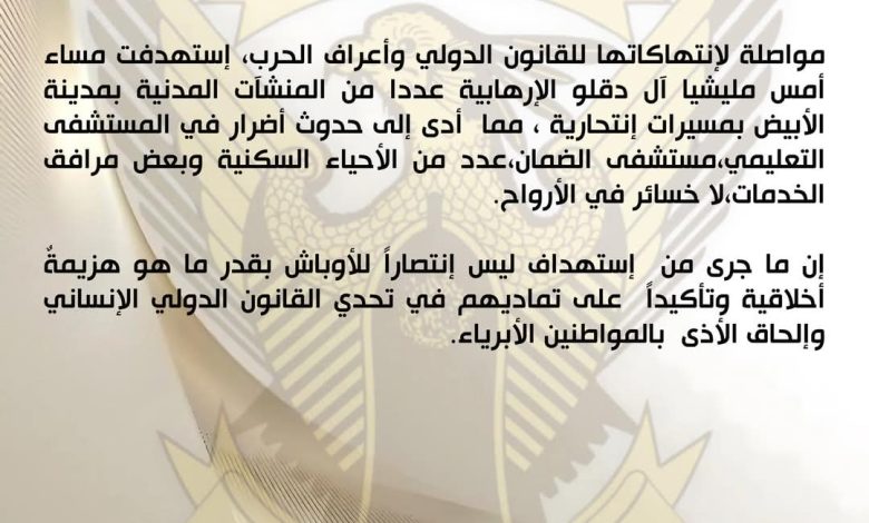 الجيش: مسيرات المليشيا استهدفت منشآت مدنية في الأبيض ولا خسائر في الأرواح