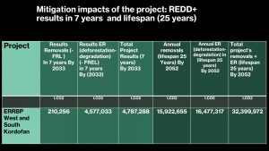 وسردت محمد الحسن النتائج المتوقعه من المشروع قائلة( أولها خفض الانبعاثات الناتجة من إزالة وتدهور الغابات ،وامتصاص 11مليون طن مكافيء من غاز ثاني أكسيد الكربون ،خلال فترة تنفيذ المشروع، وستعود الفائدة المباشرة لعدد1.3 مليون من السكان ،وهم العدد الكلي للمحليات المستهدفة كما سيستفيد من المشروع عن طريق توفير المنتجات الزراعية ومنتجات الغابات والثروة الحيوانية،مايقارب 2.7مليون من سكان الولايتين).