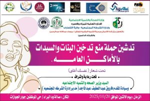 في إطار جهودها المستمرة لحماية المجتمع وتعزيز القيم الصحية والاجتماعية الإيجابية، أطلقت وزارة الصحة والتنمية الإجتماعية بولاية القضارف، ممثلة في الإدارة العامة للمرأة والأُسر، وبالتنسيق مع الإدارة العامة للشرطة المجتمعية، حملة توعوية شاملة تحت شعار:وزارة الصحة بالقضارف تطلق حملة “نفسك أغلى” للحد من ظاهرة تدخين النساء والفتيات “نفسك أغلى من عناد وكبرياء.. لحظة بسيجارة رهان على الخسارة”، وذلك بمبادرة كريمة من مدرب التنمية البشرية كوتش ميساء عبدالإله عبدالرحمن.
