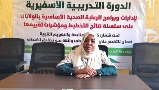 وأشارت تيسير الصادق، إلى أن الدورة يقدمها الخبير الوطني في مجال التخطيط ووضع سياسات واستراتيجيات النظام الصحي د.طارق عبدالله، والذي أكد أهمية التدريب في صقل مهارات القائمين على تقديم خدمات الرعاية الصحية الأساسية بالولايات.