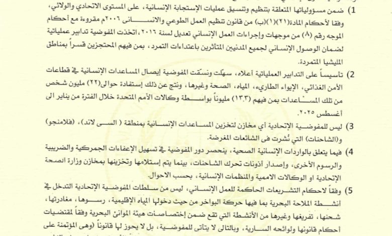 5) وفقاً لأحكام التشريعات الحاكمة للعمل الإنساني، ليس من سلطات المفوضية الإتحادية التدخل في أنشطة الملاحة البحرية بما فيها حركة البواخر من حيث دخولها المياه الإقليمية، رسوها، مغادرتها، شحنها، تفريغها وغيرها من الأنشطة التي تقع ضمن إختصاصات هيئة الموانئ البحرية وفقاً لمقتضيات أحكام قانونها ولوائحه السارية، وبالتالى لا يتأتى للمفوضية، بل لا يجوز لها قانوناً (وهى المؤتمنة على العمل الإنساني) ان تعيق وتعرقل دخول السفن وتمنعها من تفريغ شحنات الأدوية، كما ورد فى النشر الإعلامي المغرض.