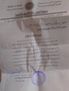 تقدم إلينا المدعو/ الأمين محمد الأمين خير الله، بطلب يريد فيه تصحيح اسمه، حيث أنه قد ورد خطأ بسجل القطعة رقم ٢٩٩ المقرن باسم/ أسامة محمد الأمين خيرالله والصحيح هو الأمين محمد الأمين خير الله عليه كل من يدعي حقه في هذه القطعة عليه الحضور لهذه المحكمة لجلسة ١/ ١٢/ ٢٠٢٥م.
