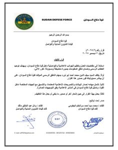 وقال قائد قيادة الشؤون المدنية والتواصل، السيد وائل عبدالخالق مالك، إن القرار جاء استناداً إلى مقتضيات العمل وتنظيم الجوانب الإعلامية والتواصلية داخل قوة دفاع السودان، وبهدف توحيد الخطاب الرسمي وضمان تدفق المعلومات بصورة منضبطة ومسؤولة.
