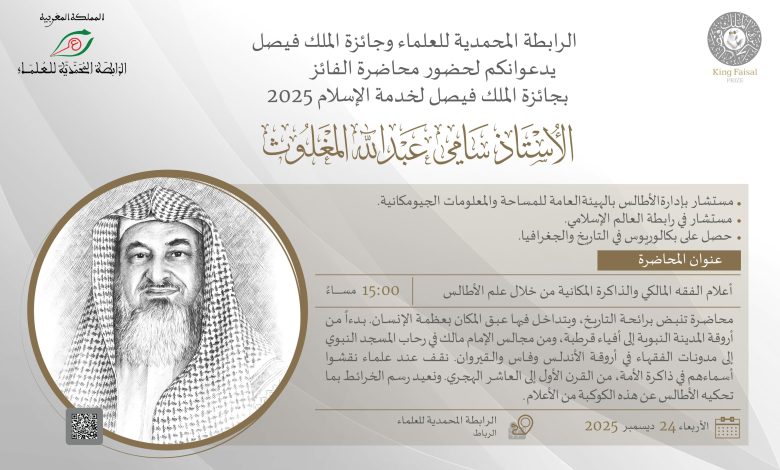تنظم جائزة الملك فيصل، بالتعاون مع الرابطة المحمدية للعلماء بالمملكة المغربية، مساء يوم الأربعاء 24 ديسمبر 2025، في مقر الرابطة بالعاصمة الرباط، محاضرة علمية بعنوان “أعلام الفقه المالكي والذاكرة المكانية من خلال علم الأطالس”.