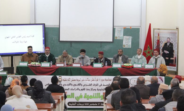 في إطار أنشطته العلمية والإشعاعية، وتنفيذًا لمضامين الرسالة الملكية السامية الموجهة إلى علماء الأمة المغربية بمناسبة مرور خمسة عشر قرنًا على ميلاد خير البرية سيدنا محمد ﷺ، نظم المجلس العلمي المحلي لإقليم الرشيدية، بتنسيق مع الكلية المتعددة التخصصات بالرشيدية، ندوة وطنية علمية في موضوع «سؤال الأخلاق والتنمية في السيرة النبوية»، وذلك يوم الأربعاء 31 دجنبر 2025، برحاب الكلية المتعددة التخصصات بالرشيدية جنوب شرق المملكة المغربية، بحضور جمع غفير من الأساتذة الجامعيين والباحثين وأعضاء المجلس العلمي المحلي، والمرشدين والمرشدات والطلبة، وممثلي بعض الهيئات والمؤسسات.
