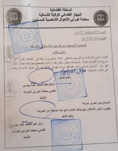 قدمت أمامي التركة باسم المرحوم المذكور أعلاه والذي ورد خطأ في القطعة رقم (۲۲) مربع (٤) الكرمته بكسلا باسم طه مختار بابكر طه، والاسم الصحيح هو/ طه مختار بابكر محمد، وأن الإسمين لمسمى واحد، عليه كل من له حق في الاعتراض في تعديل الاسم أن يحضر إلة مكاتب المحكمة خلال (١٥) يوما .