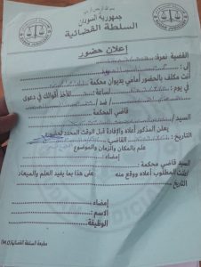 أنت مكلف بالحضور أمامي بديوان محكمة الدامر الجزئية في يوم: ٨/ ٣ / ٢٠٢٦ م الساعة التاسعة صباحا لأخذ أقوالك في دعوى أحمد صالح أحمد البشير // ضد // محمد جمعة السيد العبيد