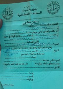 أنت مكلف بالحضور أمامي بديوان محكمة الدامر الجزئية في يوم ١٥/ ٣ / ٢٠٢٦م الساعة التاسعة والنصف صباحا لأخذ أقوالك في دعوى عمر عثمان مساعد // ضد // أميمة أم بدة