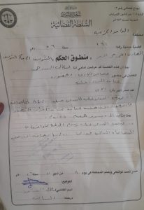 بما أن هذه القضية قد عرضت أمامي أنا بلال السر حمدو، للفصل في حضور محامي الإدعاء وحضور المدعي وغياب المدعى عليه، لقد صدر الأمر بأن: