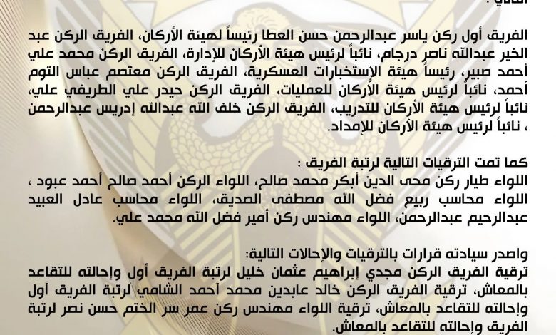 ترقية الفريق الركن خالد عابدين محمد أحمد الشامي لرتبة الفريق أول وإحالته للتقاعد بالمعاش.