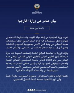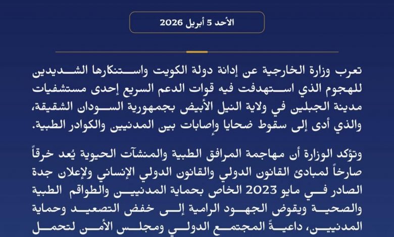 تعرب وزارة الخارجية عن إدانة دولة الكويت واستنكارها الشديدين للهجوم الذي استهدفت فيه قوات الدعم السريع إحدى مستشفيات مدينة الجبلين في ولاية النيل الأبيض بجمهورية السودان الشقيقة، والذي أدى إلى سقوط ضحايا وإصابات بين المدنيين والكوادر الطبية.