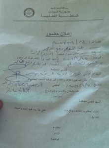 أنت مكلف بالحضور أمامي بديوان محكمة الدامر الجزئيه في يوم ١٥ / ٤/ ٢٠٢٦م الساعة ٨ صباحا لأخذ أقوالك في دعوى عبدالعزيز رحمه الله علي //ضد // عبد المنعم دفع الله محمد