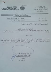 نرجو التكرم بإعلان المدعى عليه/ جال افندي موت حسب صيغة الحكم أدناه ومدنا بصورة من العدد الذي تم به الإعلان.