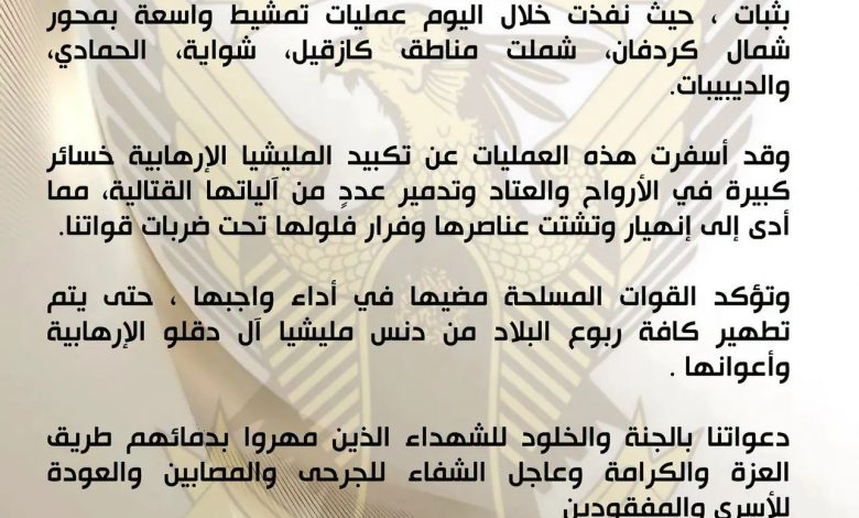 تواصل القوات المسلحة والقوات المساندة عملياتها الميدانية بثبات ، حيث نفذت خلال اليوم عمليات تمشيط واسعة بمحور شمال كردفان، شملت مناطق كازقيل، شواية، الحمادي، والديبيبات.
