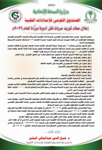 يعلن السيد/ مدير عام الصندوق القومي للإمدادات الطبية الشركات وأسماء الأعمال لتقديم عروضها للمنافسة في عطاء توريد عربات نقل أدوية مبرَّدة للعام 2026م وذلك حسب الشروط والموجهات أدناه: –