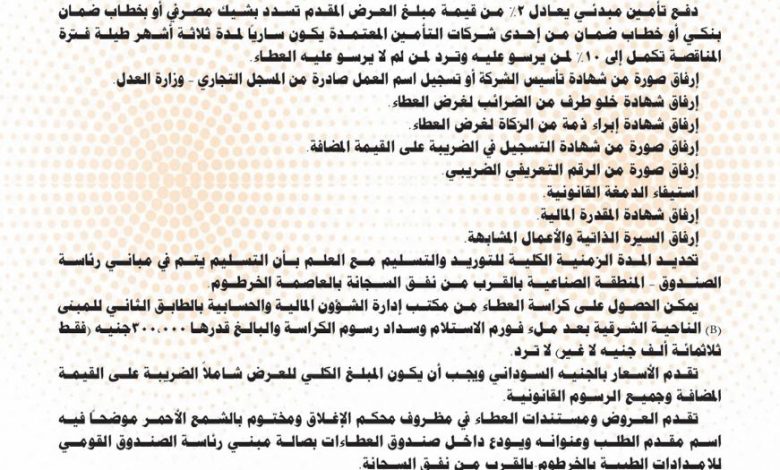تحديد المدة الزمنية الكلية للتوريد والتسليم مع العلم بأن التسليم يتم في مباني رئاسة الصندوق – المنطقة الصناعية بالقرب من نفق السجانة بالعاصمة الخرطوم.
